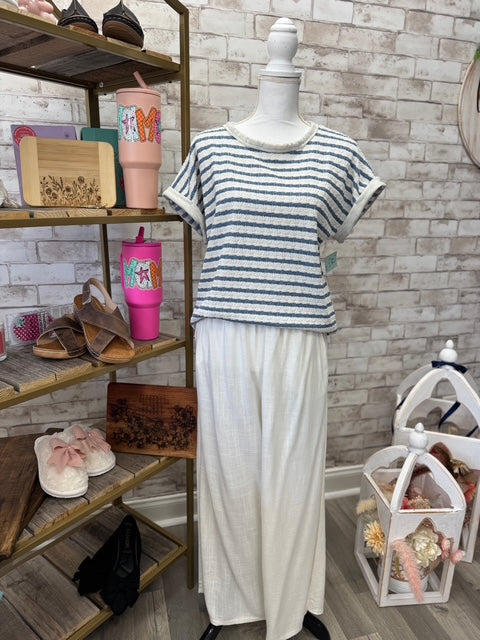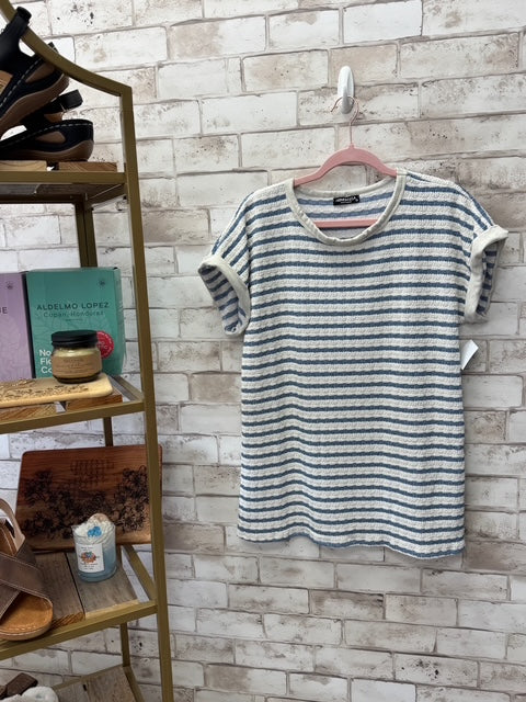 Laid-back never looked so effortlessly cool. The Heimish Coastal Stripe Terry Knit Top features soft blue and ivory stripes in a lightweight, textured terry knit that's made for casual comfort. Rolled short sleeves and a relaxed fit give this top a beachy, lived-in vibe—perfect for everyday errands, lake days, or lounging in style.