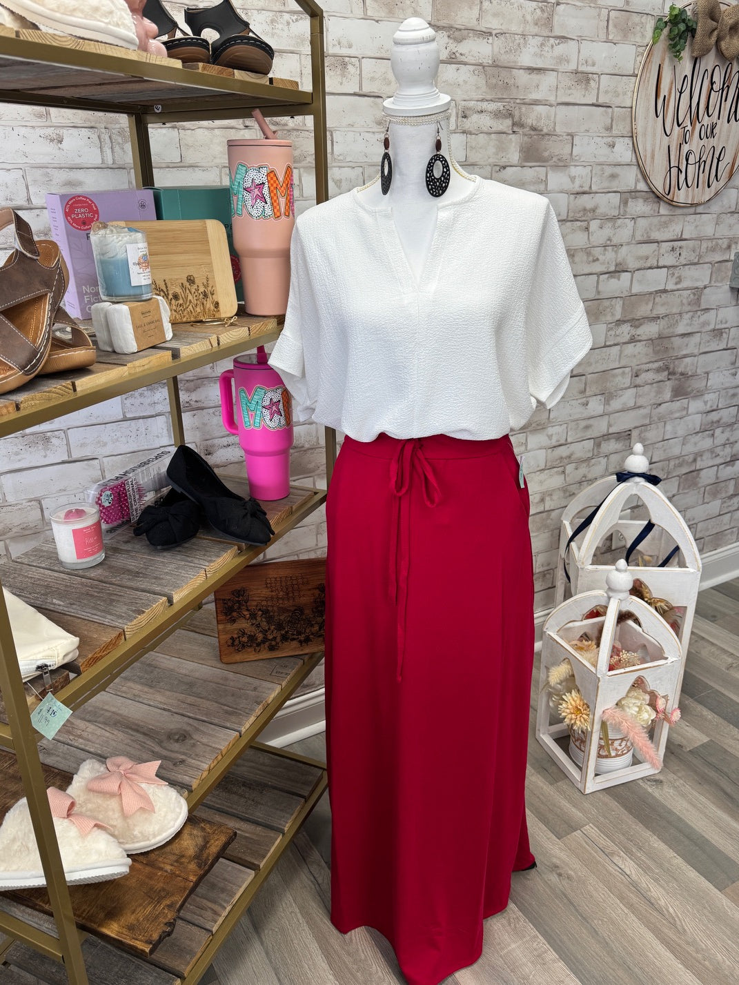 Flowy, flattering, and endlessly versatile, the Zenana Red Maxi Skirt brings bold color and effortless style to your wardrobe. Featuring a comfortable elastic waistband with a functional drawstring, this skirt offers a customizable fit that moves with you. The vibrant red hue makes a statement, while the soft, breathable fabric ensures all-day comfort.