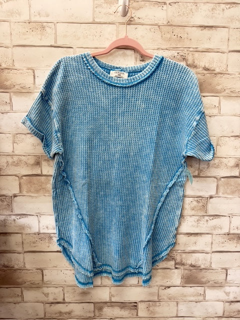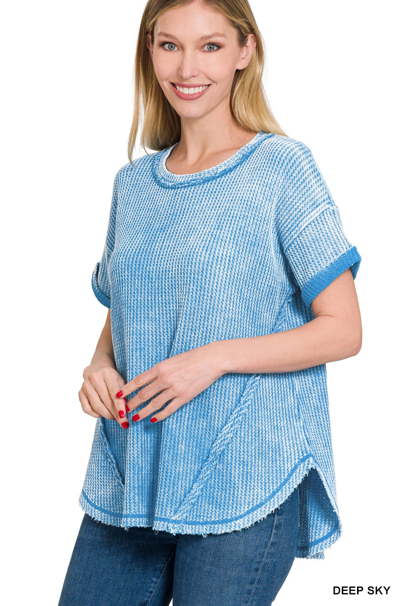 Elevate your casual wardrobe with this effortlessly stylish waffle knit top from Zenana. Designed with a soft, breathable texture, it features a relaxed, flowy fit perfect for everyday comfort. The raw edge detailing, high-low hem, and cuffed short sleeves add modern touches to a classic silhouette.
