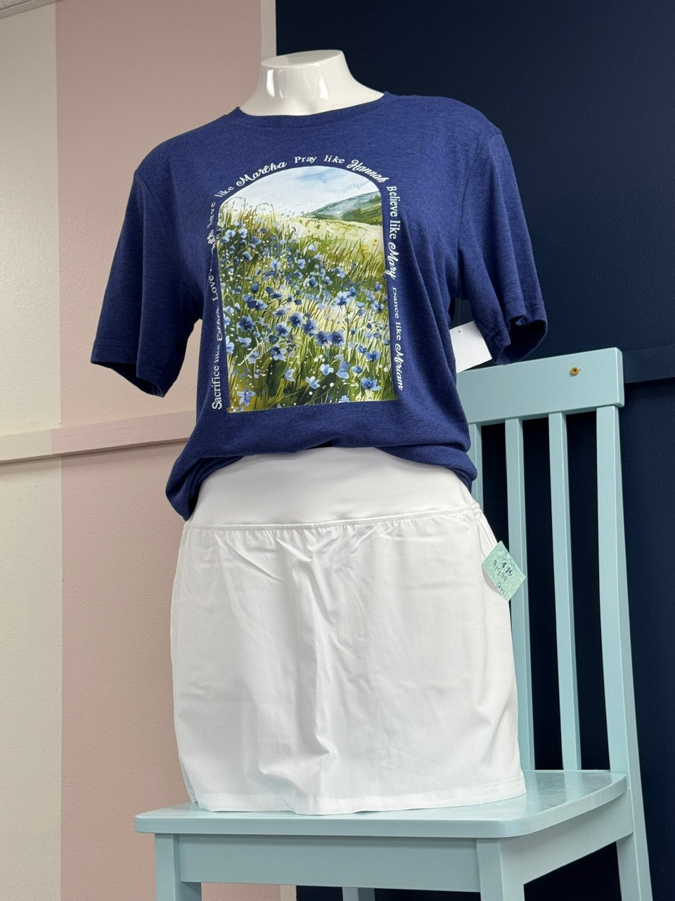 Add a meaningful touch to your wardrobe with our Wildflower Faith tee. Featuring a serene field of blue wildflowers with a mountain backdrop, this soft navy t-shirt offers both comfort and inspiration. The artwork is framed by an encouraging message: